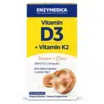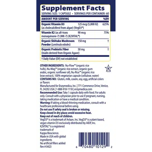 Enzymedica’s Made with Organic D3 + K2 formula provides 5,000 IU of Vitamin D3 and 90 mcg of Vitamin K2 to support immune and bone health.* When combined with Vitamin D3, this soy-free K2, K2VITAL® supports the proper transportation and absorption of calcium into the bones.* Like Vitamin D3, Vitamin K2 is an essential Vitamin, meaning the body cannot make it, so it must be obtained through diet or supplements. Supplementing with D3 alone is not enough. Combining both essential Vitamins allow Vitamin D3 to properly absorb calcium into the bones.*